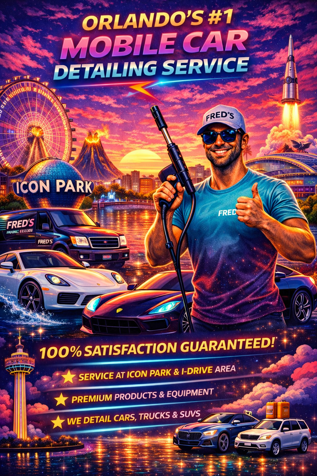 Mobile Cr Wash Orlando, Looking for a mobile car wash near ICON Park Orlando? Fred’s Mobile Car Wash & Auto Detailing delivers same-day mobile car detailing, interior cleaning, exterior hand washing, paint correction, and ceramic coating directly to your hotel, apartment, office, or parking garage near ICON Park and International Drive. Our fully equipped mobile detailing vans bring spot-free water, professional tools, and premium detailing products to your location for fast, convenient, showroom-quality results.